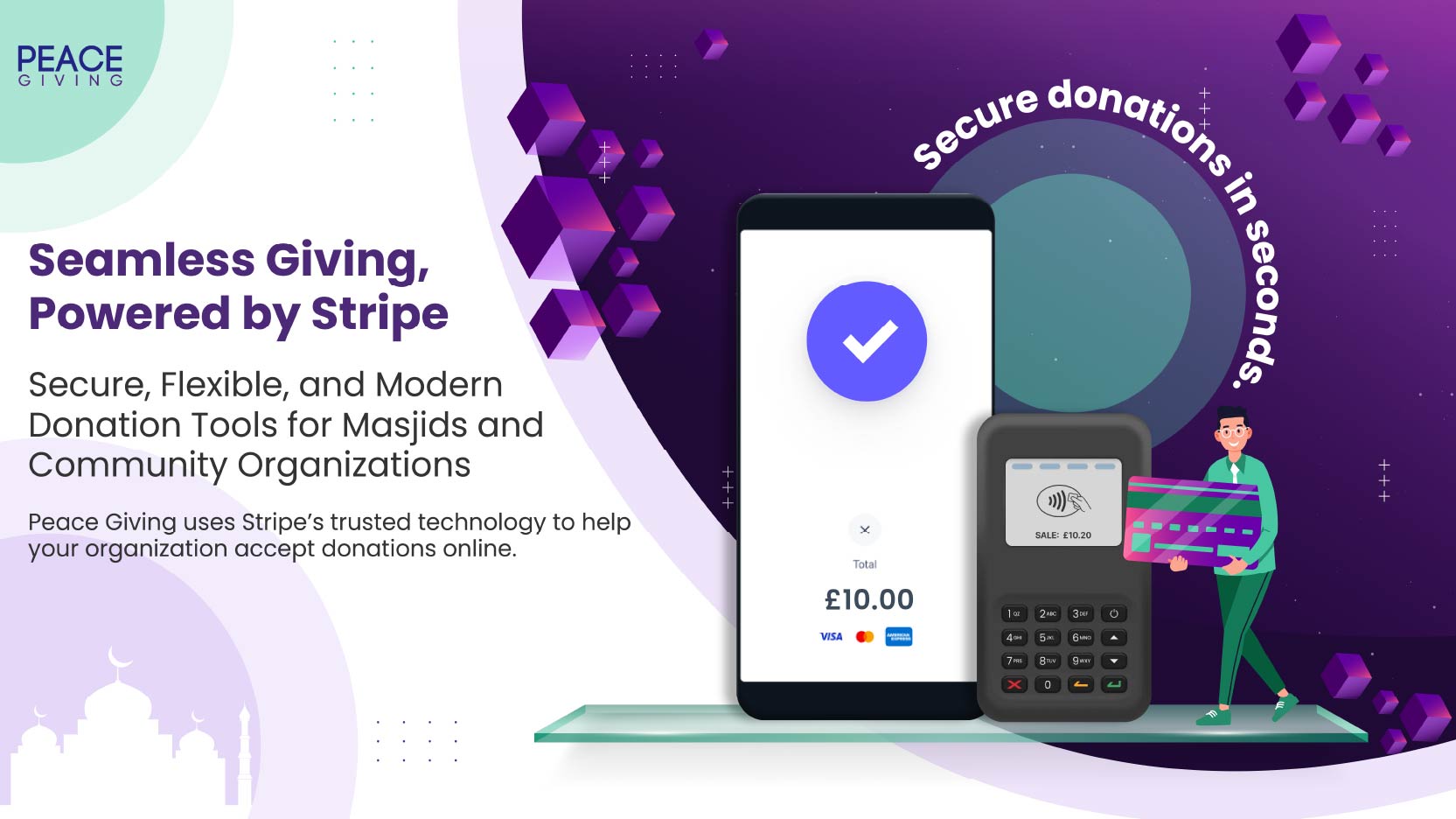 Peace Giving helps Masjids and community organizations accept donations in a modern, contactless way. By using Stripe’s trusted payment infrastructure, we enable secure and flexible donations through chip, contactless, online, and QR code options.